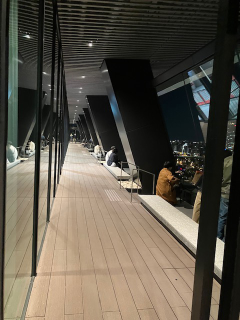 | 16階の展望台はガラス張りで、ガラス窓の手前はウッドデッキになっていて、窓に沿ってベンチで座れるようになっているので、ダイレクトに夜景を目の前で楽しめるような設計になっています。