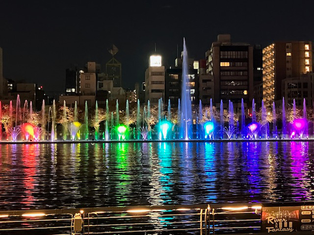 | 特に夜は色とりどりのライトアップと噴水ショーで、八軒家浜の水辺が更に華やぎます。天神橋と天満橋の間の河川上に横幅約100メートルにわたって設置された噴水で、水と光と音が同時に楽しめて、大阪・関西万博の水上ショーを思い出してしまいました(なつかしい~)♪