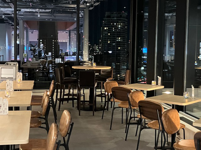 | カフェの解放感ある高い天井と広い窓から、夜景が見えています。お昼間の景色もいいでしょうね~お店(ラ・ボーテ)から近いので、出勤前のカフェ時間にいいなぁ~♪