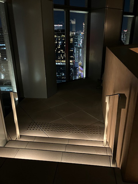| 16階の展望台はガラス張りで、ガラス窓の手前はウッドデッキになっていて、窓に沿ってベンチで座れるようになっているので、ダイレクトに夜景を目の前で楽しめるような設計になっています。