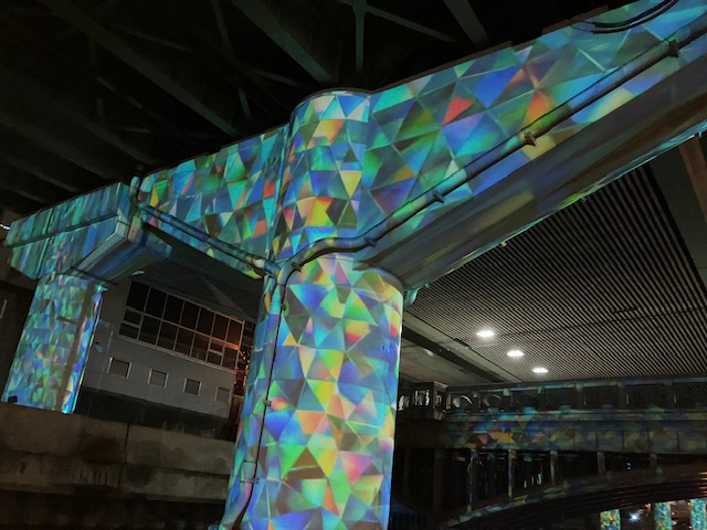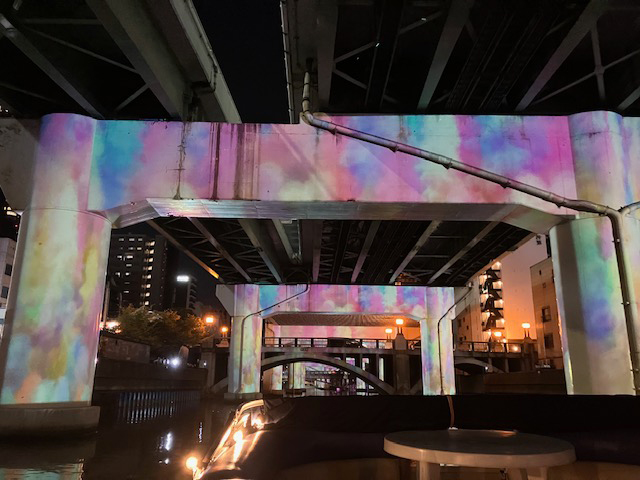 | 東横堀川を覆う阪神高速道路の橋脚に全長約650メートルという長いスケールに、幻想的な映像が展開されているプロジェクションマッピングをクルーズ船で、橋脚の間をゆっくり進みながら見るのは初体験にて情緒がありますね~