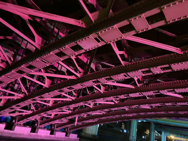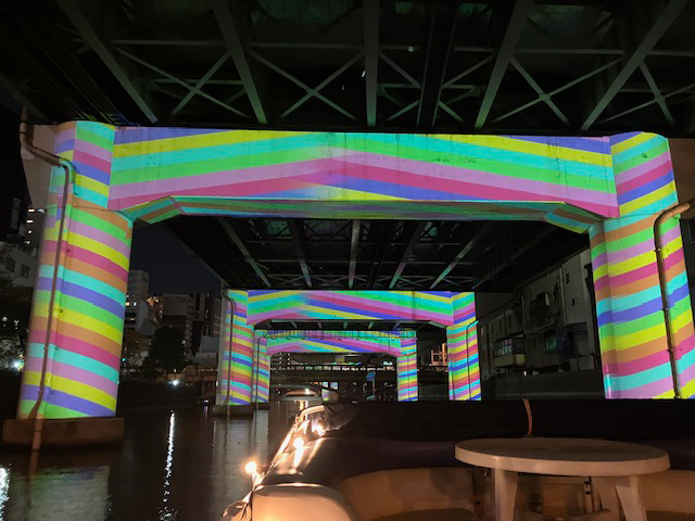 | ゆっくりながら橋脚をキャンバスにして次々と色柄を変えていくマッピングの様子を川に浮かぶ船上から見上げられるなんて幻想的ですね~