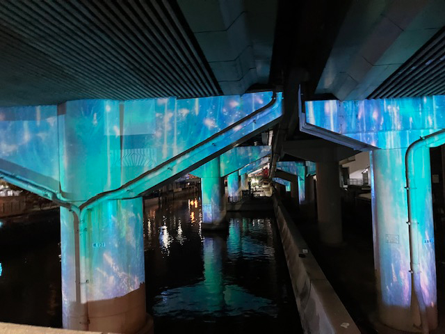 | まずは、世界最大級、演出範囲650メートルで水都を体感できる水辺のプロジェクションマッピングを見学しました。東横堀川、高麗橋から本町橋の範囲の多くの橋脚が鮮やかにマッピングされています☆
