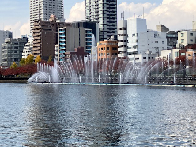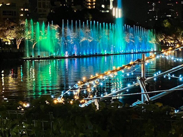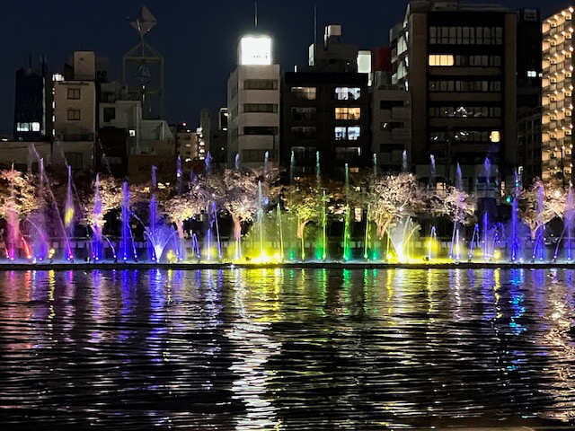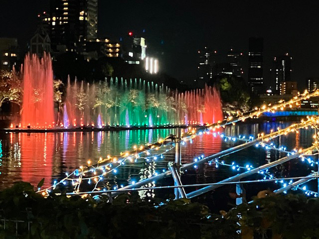 | 特に夜は色とりどりのライトアップと噴水ショーで、八軒家浜の水辺が更に華やぎます。天神橋と天満橋の間の河川上に横幅約100メートルにわたって設置された噴水で、水と光と音が同時に楽しめて、大阪・関西万博の水上ショーを思い出してしまいました(なつかしい~)♪