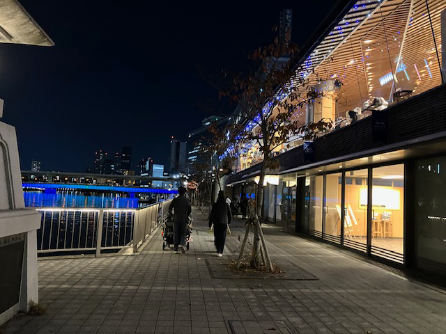 | 夜間は、大川沿いのイルミネーションを意識したような、キラキラ感がある店舗になっています☆