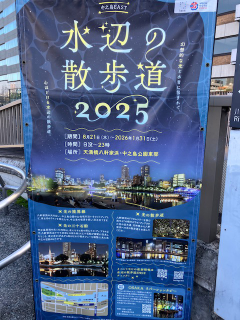 | 次にご紹介するのは、京阪及び地下鉄谷町線の天満橋駅すぐにある、桜の時期や天神祭りで有名な大川の右岸の護岸にある八軒家浜です。八軒家浜は、長年住んでいる私自宅から5分のところにあって、しょっちゅう通りますが、今年のイルミネーションは格別きれいです☆やっぱり大阪・関西万博の影響もあったのでしょうか~?