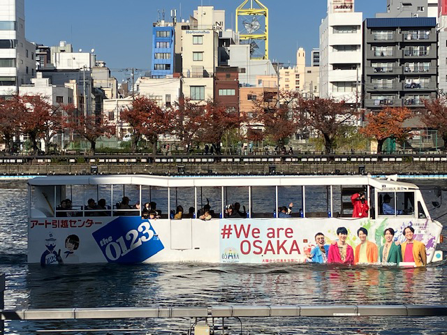 | 水陸両用の観光バスも、ゆっくりと大川を遊覧しています。