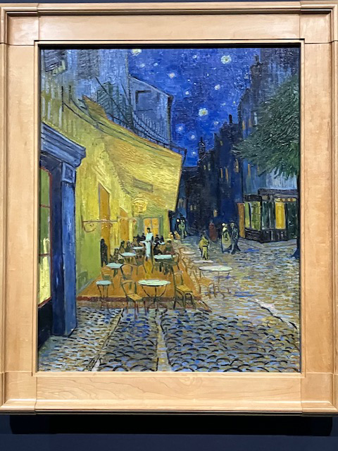 | 今回の展示会の代表作品「夜のカフェテラス」です。南フランス・アルルの星空の下、ガス灯で照らされた人でにぎわうカフェが描かれていて、この絵でゴッホは初めて黒をあまり使わずに夜空を描いた作品らしく、夜空に描かれている星座、星がとても美しくかつ、実際に見ると美しさと迫力も感じる作品です。