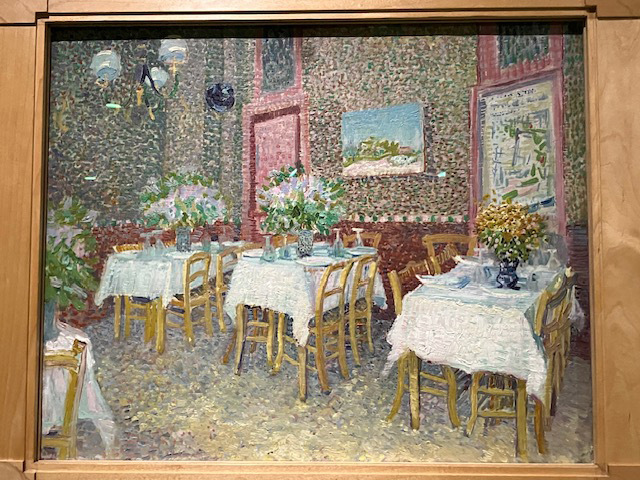 | この作品はゴッホがパリに出てきて、当時の印象派の画家たちと交流をもった時に描いた「レストランの室内」という作品ですが、点々で描く画法がモネっぽいなどと、素人の感想ですが(笑)