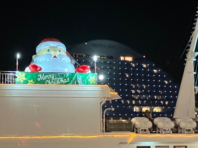 | 港の遊覧船には、巨大サンタも乗っています。